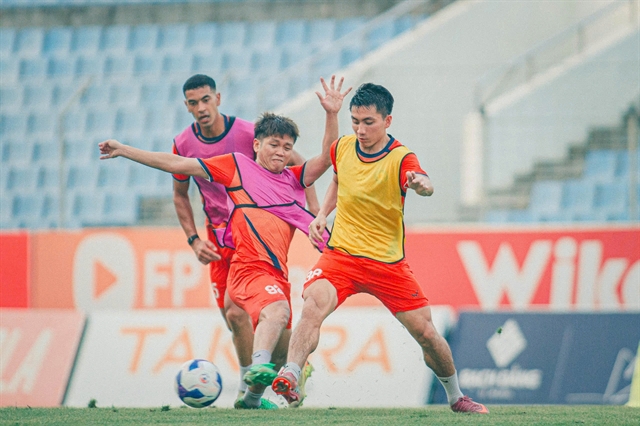 | Players of SHB Đà Nẵng trian at Chi Lăng Stadium in preparation for the national football championship. — Photo courtesy of Thắng VIC |