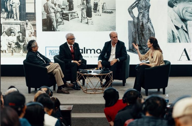Art researcher Ngô Kim Khôi (second left) in a discussion led by president of the Association des Artistes d'Asie à Paris, Charlotte Aguttes-Reynier. Photo vietnamplus.vn |