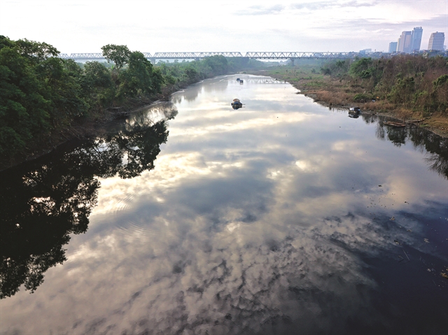 | GLISTENING: Chương Dương Bridge spanning the Red River in the early morning light. |
