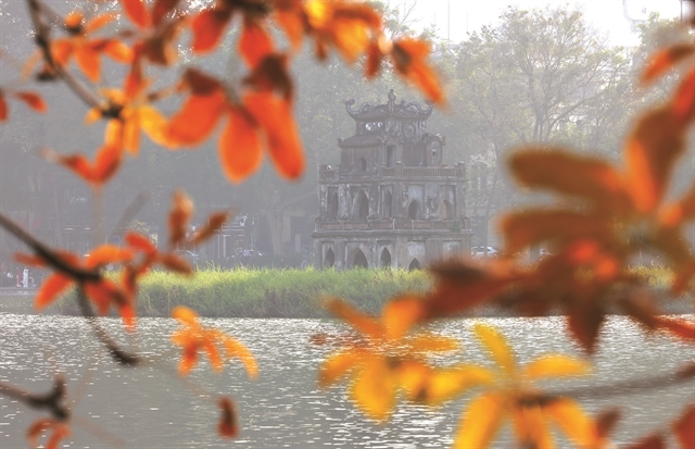 | AUTUMN FEELING: Turtle Tower surrounded by yellow-orange leaves on Hoàn Kiếm Lake. VNS photos Trương Vị |