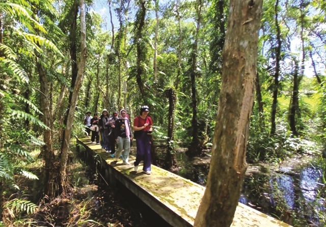 | Visitors walk along a path through the cajeput forest at the Trẹm River Ecotourism Area. VNA/VNS Photo |
