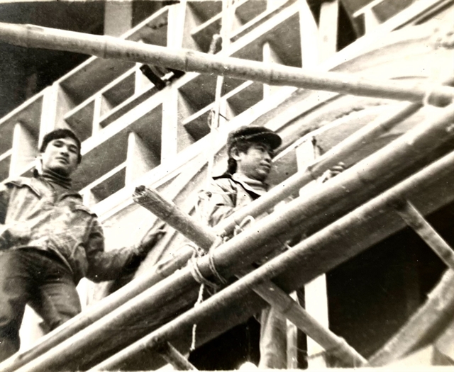 | Đặng Đan Đỉnh (left) installing the clock at Hà Nội Station over 40 years ago. The clock still runs properly. Photo courtesy of Đặng Đan Đỉnh |
