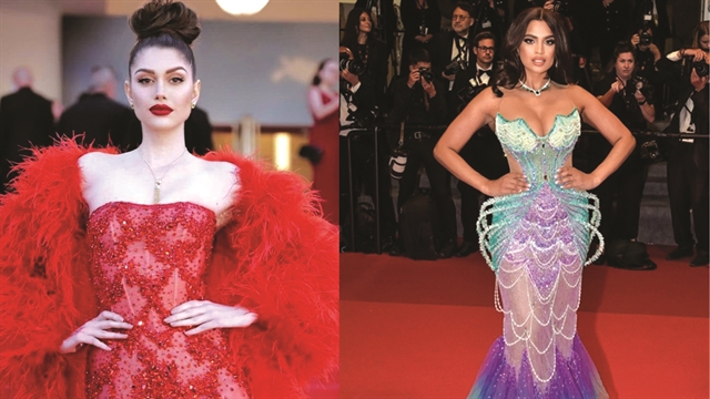 Miss Grand International 2022 Isabella Menin (left) in a design by Lê Thanh Hòa and Miss Earth Malaysia 2021 Nisha Thayananthan in a design by Nguyễn Minh Tuấn at the Cannes Film Festival in 2024. Photo courtesy of the designers |