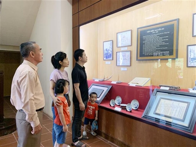 | Tourists explore artefacts displayed inside the Nguyễn Du Memorial Site. VNA/VNS Photo Hữu Quyết |