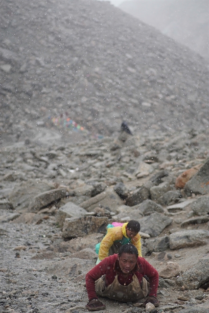 | A father and son perform full-body prostrations every three steps along the kora pilgrimage around Mount Kailash in May 2017, reflecting the profound faith of the Himalayan people. |