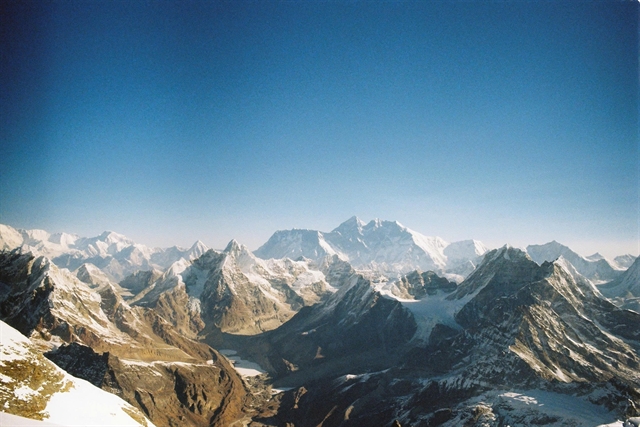 | Everest rises alongside the world’s highest peaks in the Himalayas, seen from Namche Bazaar in September 2015. |
