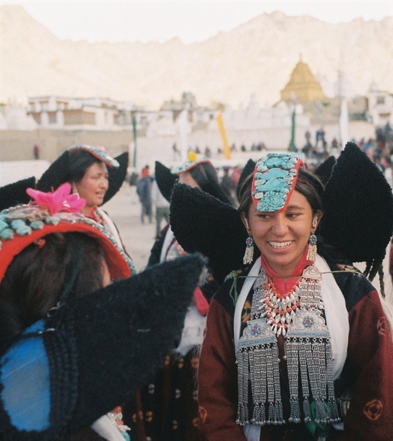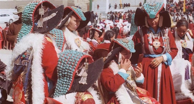 | Ladakhi women in traditional attire at an annual festival. |