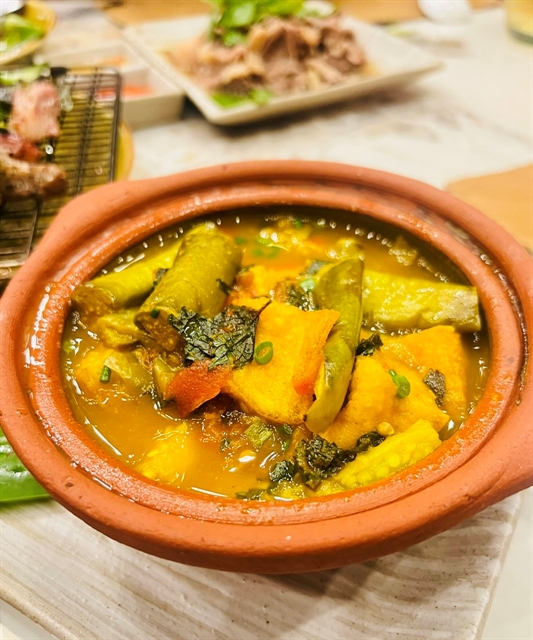 Braised aubergine with tofu and green banana, served in a clay pot. VNS Photo Thúy Hằng |