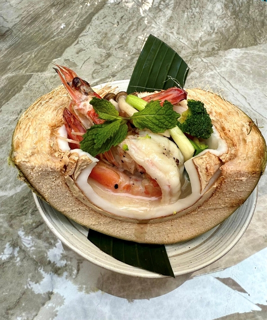 We were fully immersed in the flow of Vietnamese flavours when Vincent introduced one final dish: prawns in coconut cream. Served in a fresh coconut, it featured tiger prawns and a medley of vegetables – mushrooms, carrots and broccoli – all gently simmered in naturally sweet coconut juice and enriched with a touch of coconut cream.