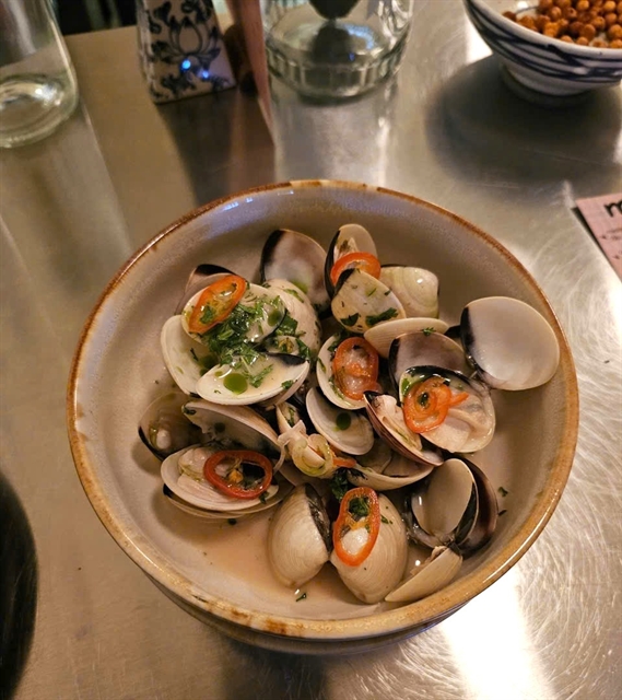 | Clams with chao sabayon and pickled chilli. Photo courtesy of Hà Thu Phạm |