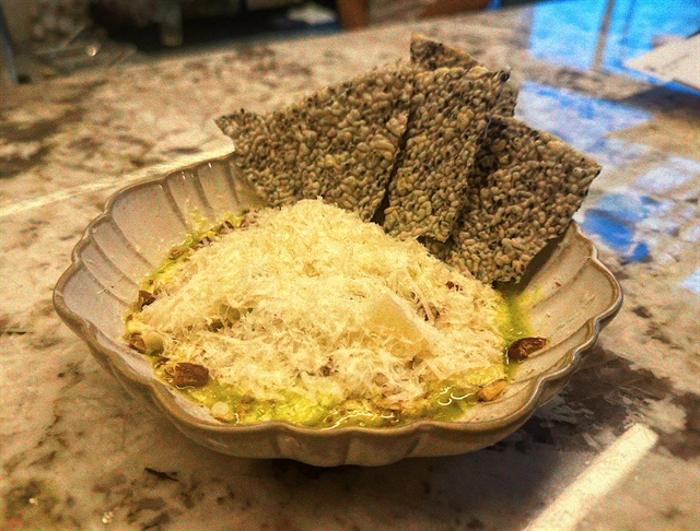 Grilled cauliflower comes heavily laden with pecorino. Scoop with a rice cracker and the cheese loosens, melts, and folds into the smoked cashew purée beneath. It is as rich as it is moreish, leaving me absent-mindedly running a finger through the last streaks of sauce because I don’t wish for it to end.