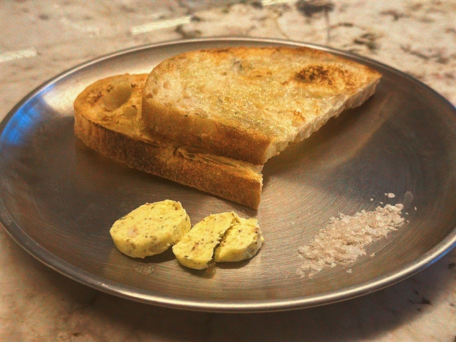 | CROWN JEWEL: Sourdough, bone marrow butter, smoked Maldon salt. Perfection. |