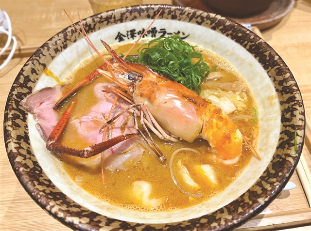 | A bowl of miso ramen topped with a large prawn and slices of pork. — VNS Photo Việt Dũng |