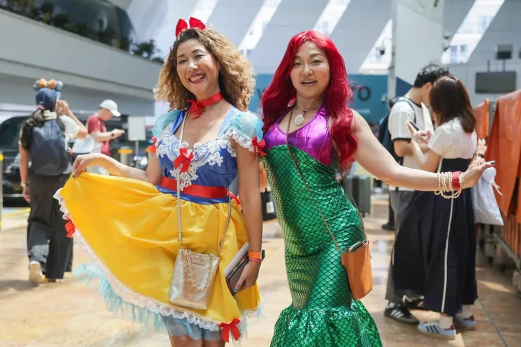 Spotted among the crowd were passengers dressed as Disney characters such as Belle from Beauty and the Beast (1991) and Snow White from Snow White and the Seven Dwarfs (1937). Many others donned Disney-themed attire – from Mickey ears headbands to printed T-shirts and hats – and carried totes with numerous character plush toy keychains.