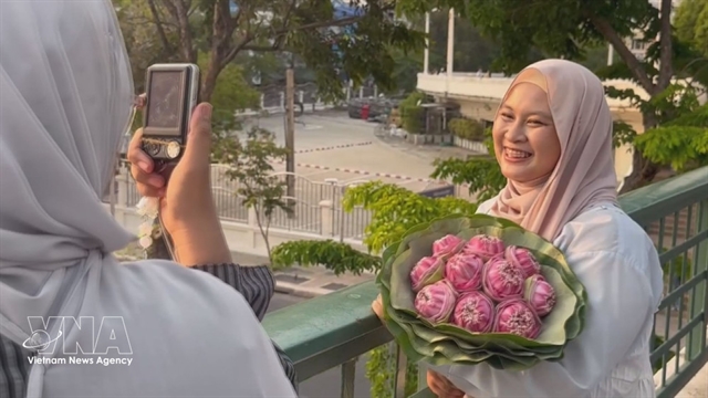 | Foreign visitors take photos with lotus flowers at Phra Phutthayotfa Bridge. — VNA/VNS Photo |