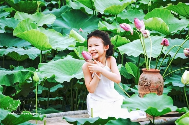 | A young child enjoys taking photos with lotus flowers in Tây Hồ (West Lake), Hà Nội. — VNA/VNS Photo |